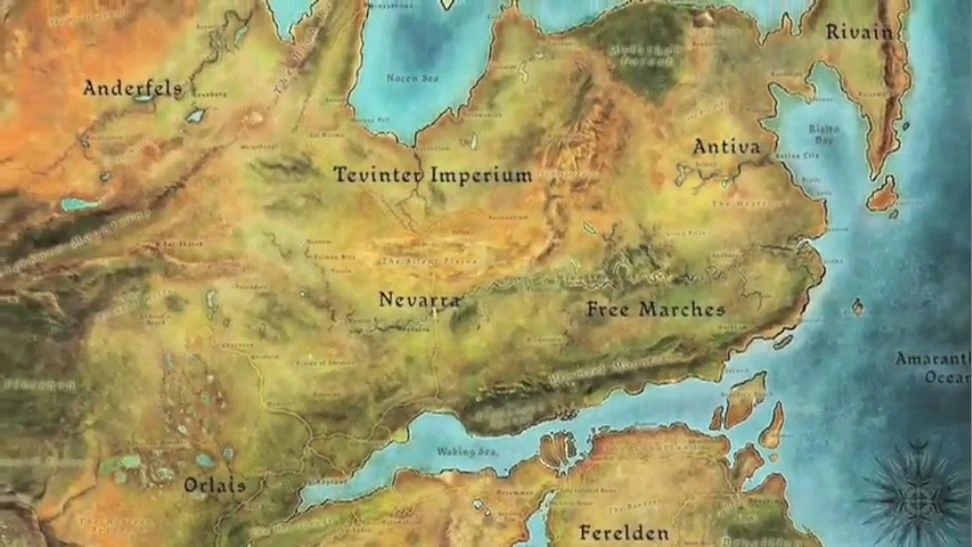 Thedas is bounded to the east by the Amaranthine Ocean, to the west by Tirashan Forest and the...